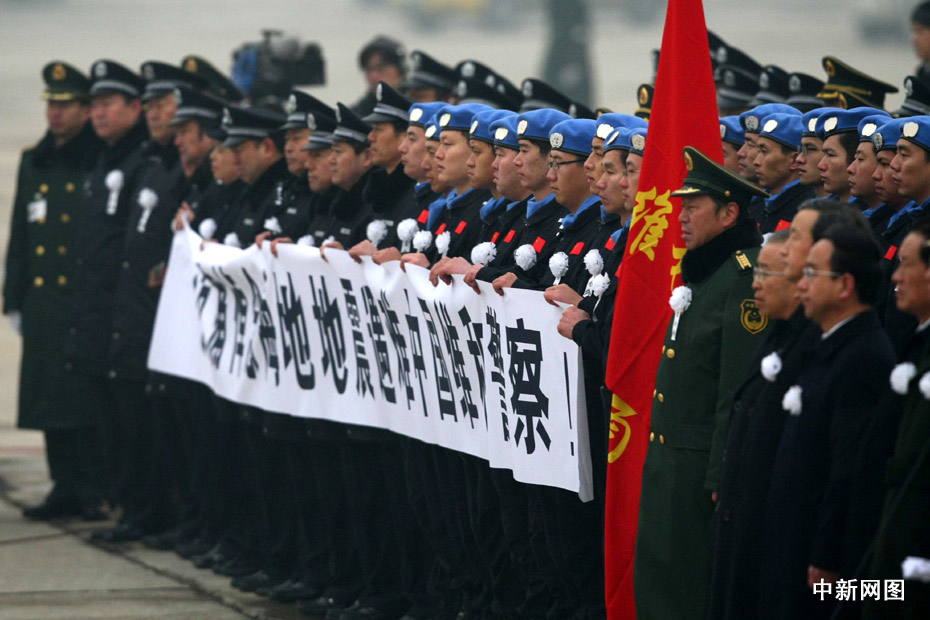 1月19日上午,在海地地震中犧牲的八位中國維和警察遺體回國接機儀式在北京首都機場舉行。中新社記者 富田 攝