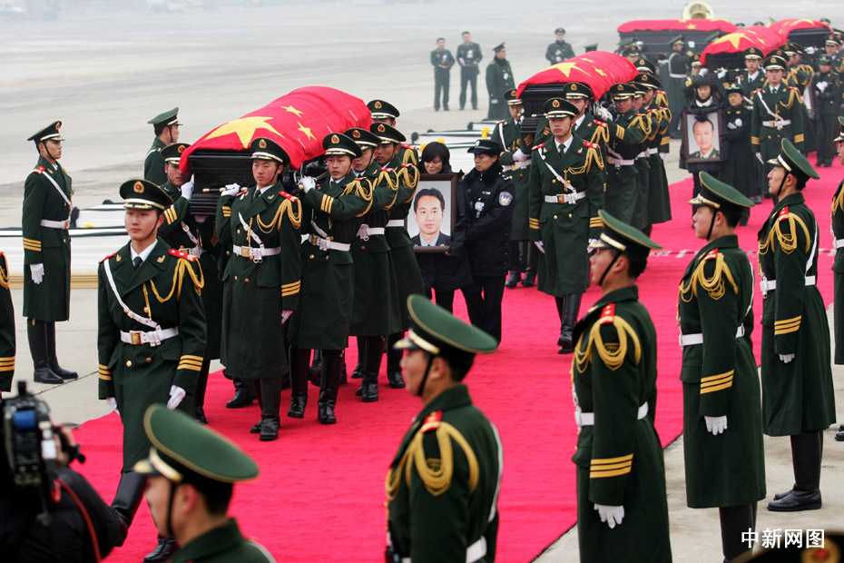 1月19日上午,在海地地震中犧牲的八位中國維和警察遺體回國接機(jī)儀式在北京首都機(jī)場舉行。中新社記者 富田 攝