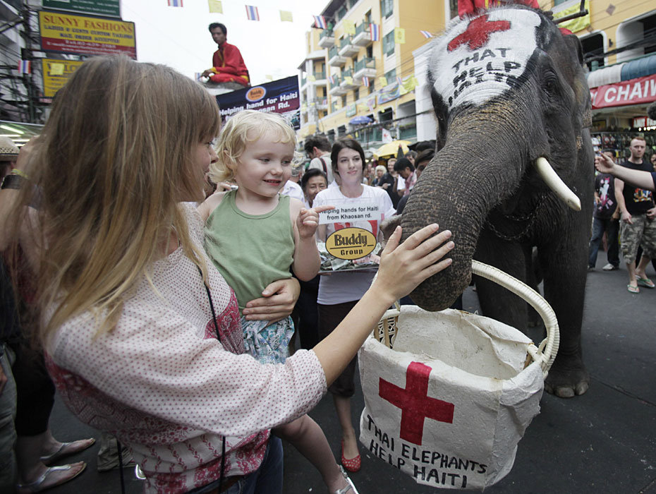 1月21日,在泰國首都曼谷舉辦了一場大象為海地災區(qū)募捐活動。人們紛紛向大象攜帶的籃子內(nèi)放入善款,向海地地震幸存者獻上一份愛心。圖片來源:中國新聞網(wǎng)