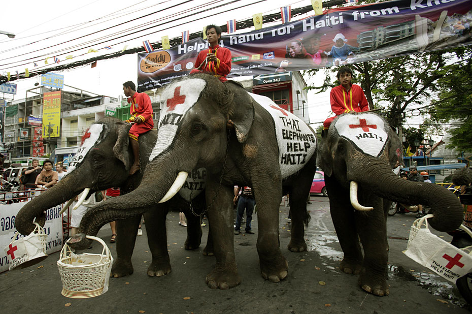 1月21日,在泰國首都曼谷舉辦了一場大象為海地災(zāi)區(qū)募捐活動。人們紛紛向大象攜帶的籃子內(nèi)放入善款,向海地地震幸存者獻(xiàn)上一份愛心。圖片來源:中國新聞網(wǎng)