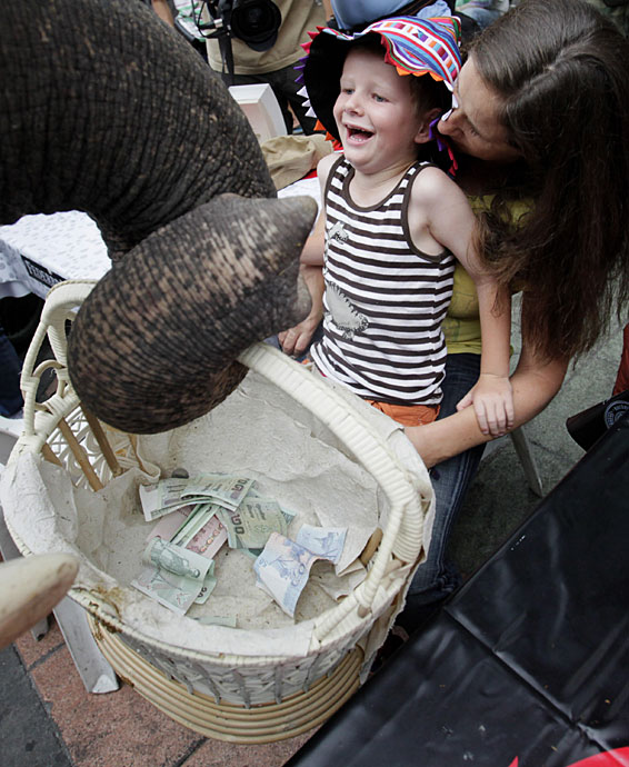 1月21日,在泰國(guó)首都曼谷舉辦了一場(chǎng)大象為海地災(zāi)區(qū)募捐活動(dòng)。人們紛紛向大象攜帶的籃子內(nèi)放入善款,向海地地震幸存者獻(xiàn)上一份愛心。圖片來(lái)源:中國(guó)新聞網(wǎng)