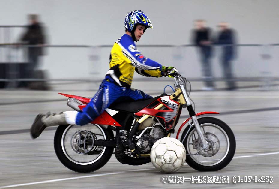 1月22日,國際摩托車貿(mào)易博覽會上,一場名為“魅力摩托”的足球比賽吸引了眾人的目光,參賽者駕駛摩托的同時還不忘將足球送入對方的大門。 圖片來源:中國新聞網(wǎng)>>點(diǎn)擊觀看詳細(xì)內(nèi)容