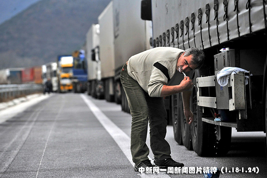 1月21日,一名卡車司機(jī)在希臘-保加利亞邊境的一個(gè)岔道口刷牙。希臘農(nóng)民封堵了道路,要求國(guó)家提供救助以彌補(bǔ)農(nóng)產(chǎn)品價(jià)格偏低帶來(lái)的損失。圖片來(lái)源:中國(guó)新聞網(wǎng)