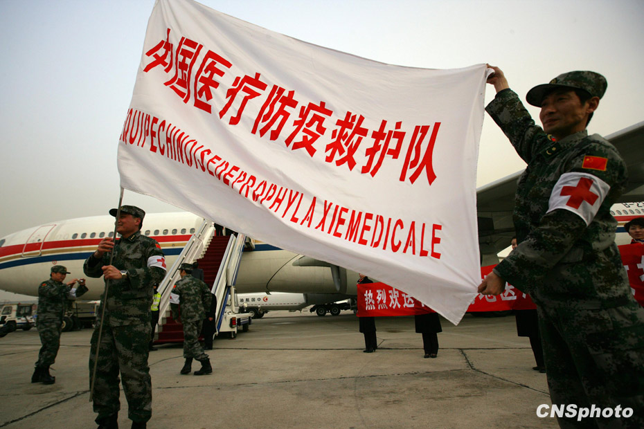 1月24日18時,由中國人民解放軍醫(yī)護人員和管理人員組成的中國醫(yī)療防疫救護隊一行40人乘坐軍運包機離開北京,啟程前往海地進行人道主義救援任務。