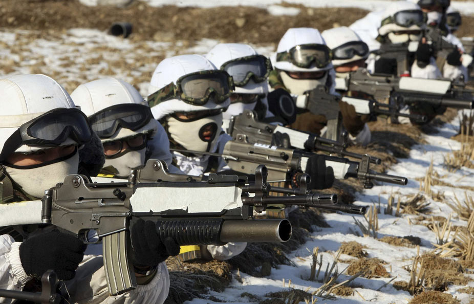 1月27日,韓國江原道,韓國陸軍部隊在嚴寒中進行戰(zhàn)術訓練。