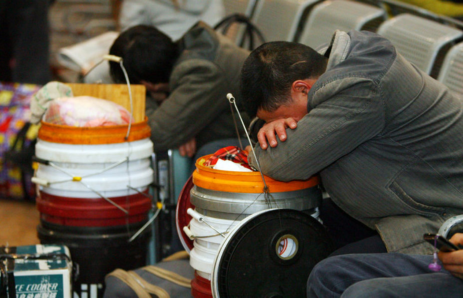 一年一度的春運(yùn)今日起正式開(kāi)始。2010年的春運(yùn)從1月30日起至3月10日,為期40天,其中節(jié)前15天,節(jié)后25天。據(jù)權(quán)威預(yù)測(cè),今年春運(yùn)客運(yùn)量料超25億人次。圖為1月30日,幾名旅客在西安火車站候車大廳熟睡。 侯智 攝