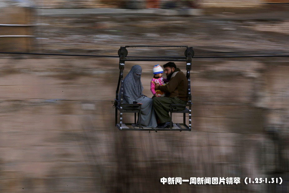 1月29日(周五),巴基斯坦,一家三口正在搭乘繩索過(guò)橋。圖片來(lái)源:中國(guó)新聞網(wǎng)
