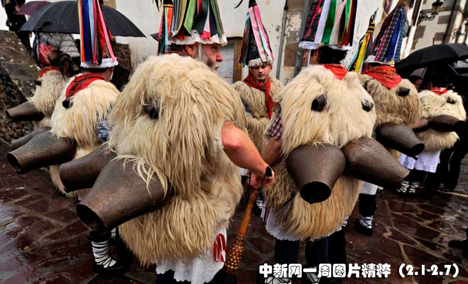 2月1日(周一),在西班牙Ituren村舉行的傳統(tǒng)游行上,身穿羊皮服飾的男子走街穿巷,驅(qū)趕土地上的惡魔,迎接春天的到來。圖片來源:中國新聞網(wǎng)