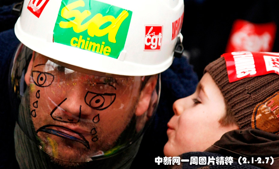 2月4日(周四),在法國敦克爾的罷工游行示威中,法國石油巨頭道達爾(TOTAL)的一名員工戴著頭盔,面罩上畫著一張哭泣的臉。自去年9月開始,敦克爾廠區(qū)就一直處于停工狀態(tài)。圖片來源:中國新聞網(wǎng)