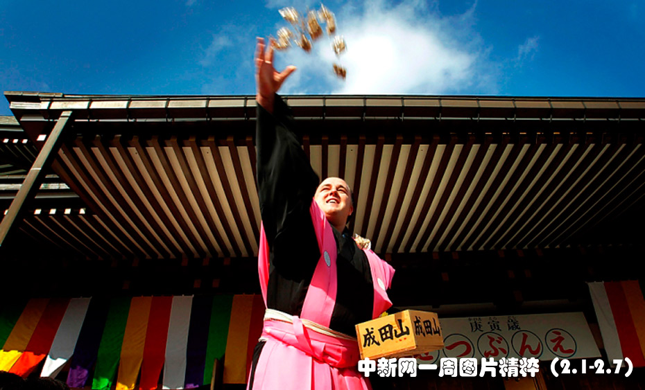 2月3日(周三),在日本千葉成田的一座寺廟,相撲新手、來自愛沙尼亞的巴魯托(Baruto)向人群拋撒袋裝的大豆。這種儀式通常在農(nóng)歷新年進(jìn)行,據(jù)說可以帶來好運(yùn)。圖片來源:中國(guó)新聞網(wǎng)