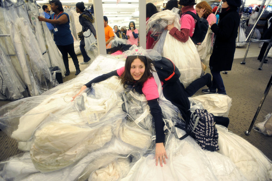 近日,美國紐約一年一度的“新娘快跑”婚紗促銷活動舉行。千余名來自全美各地的準新娘和親朋好友,早早就在門口等候,平時上千美元婚紗只需要五分之一的價格就能帶回家。圖片來源:中國新聞網