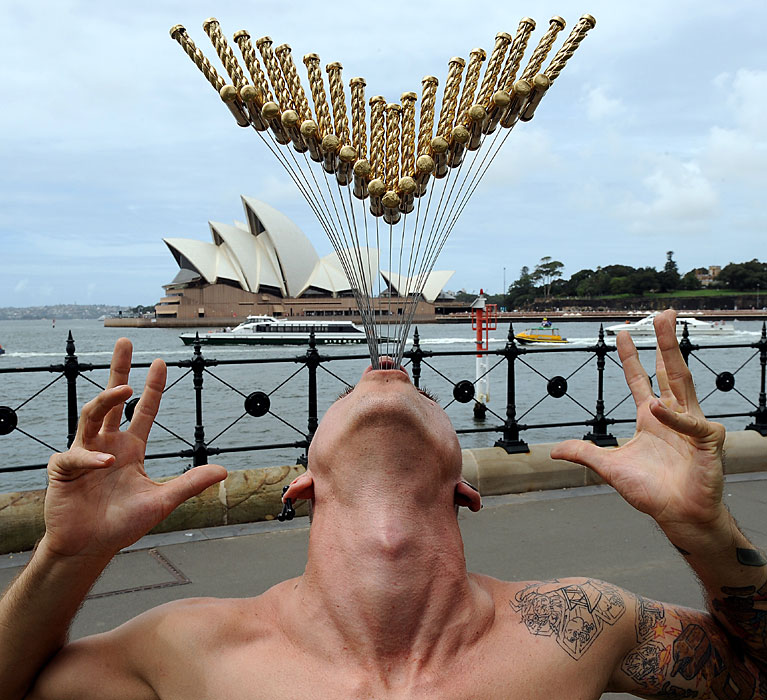 2月8日,街頭藝人Chayne Hultgren在澳大利亞悉尼海港大橋前,一次吞下18把厚約1.3厘米,長約50.8厘米的長劍,刷新了吉尼斯世界紀錄。圖片來源:中國新聞網(wǎng)