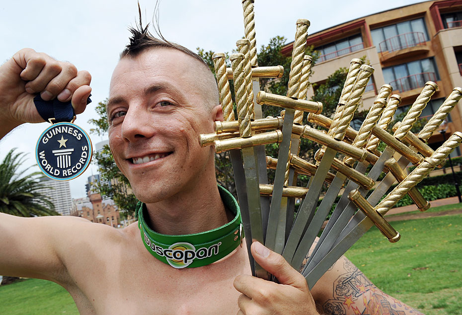 2月8日,街頭藝人Chayne Hultgren在澳大利亞悉尼海港大橋前,一次吞下18把厚約1.3厘米,長約50.8厘米的長劍,刷新了吉尼斯世界紀錄。圖片來源:中國新聞網(wǎng)