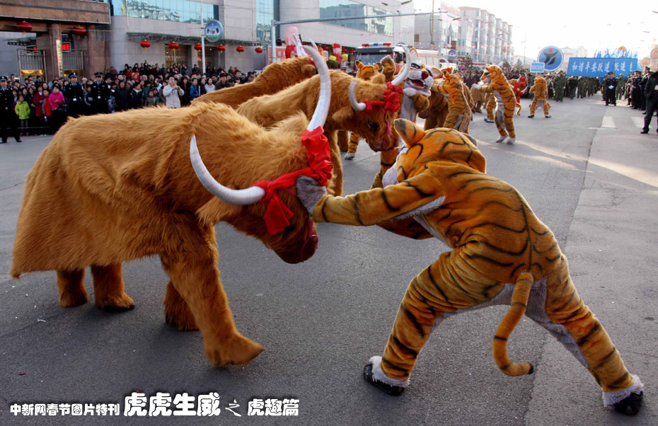 2月10日是正月十六,山西省盂縣舉辦《金牛鬧春》大型街頭春節(jié)文化活動(dòng)節(jié)目展演,為現(xiàn)場(chǎng)5萬(wàn)余名觀眾奉上了一場(chǎng)豐盛的元宵節(jié)文化大餐。盂縣西小坪村的旱船和東城武村的腦閣及石店煤礦的牛逗虎是展演活動(dòng)中的三項(xiàng)非物質(zhì)文化遺產(chǎn)保護(hù)項(xiàng)目,是最有特色的民間紅火形式之一,它不僅歷史悠久,而且因?yàn)榈谰咴煨酮?dú)特,表演套路豐富,音樂(lè)伴奏喜慶熱烈而受歡迎。中新社發(fā) 程瑜 攝