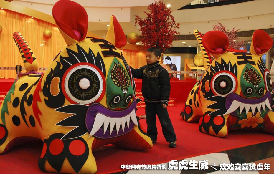 1月下旬,曾榮獲中國民間藝術高層論壇金獎等多項榮譽的純手工布藝老虎,來到重慶賀新春。在重慶某商場展示的這對布老虎是由奧運福娃設計者韓美林的得意弟子劉清華親自設計并制作。圖為身長2.2米、寬1.2米、高1.7米的布老虎吸引小朋友駐足拍照留念。中新社發(fā) 郭晉嘉 攝