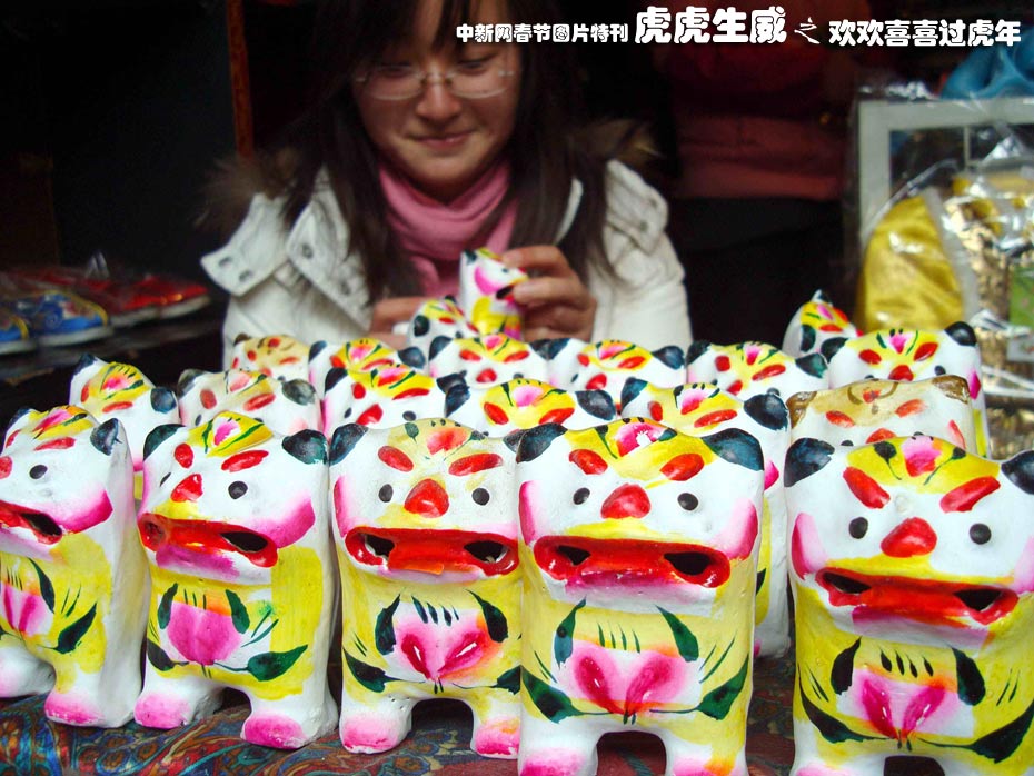 1月15日,虎年臨近,蘇州山塘街民間藝人制作的傳統(tǒng)玩具“皮老虎”引起了許多市民和游人的濃厚興趣!捌だ匣ⅰ笔翘K州民間傳統(tǒng)玩具,用膠泥燒制虎頭與虎尾,中間用軟羊皮將虎身粘合,在虎口中置一哨,用手輕輕一拉一合,便可發(fā)出悅耳動聽的皮虎歌唱。中新社發(fā) 王建康 攝