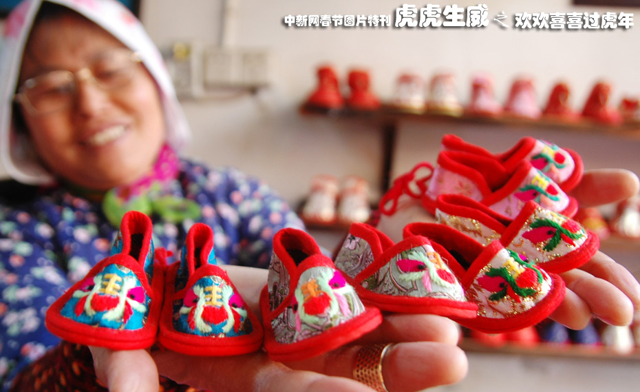 元旦佳節(jié),蘇州周莊風景區(qū)內的文化街市上“迷你”虎鞋俏銷;⒛甑搅嗽诮系貐^(qū)民間有著“虎年到送虎鞋”的傳統(tǒng)習俗,集市上造型別致的“虎頭鞋”格外受到游客和市民們的青睞。 中新社發(fā) 蘇民 攝