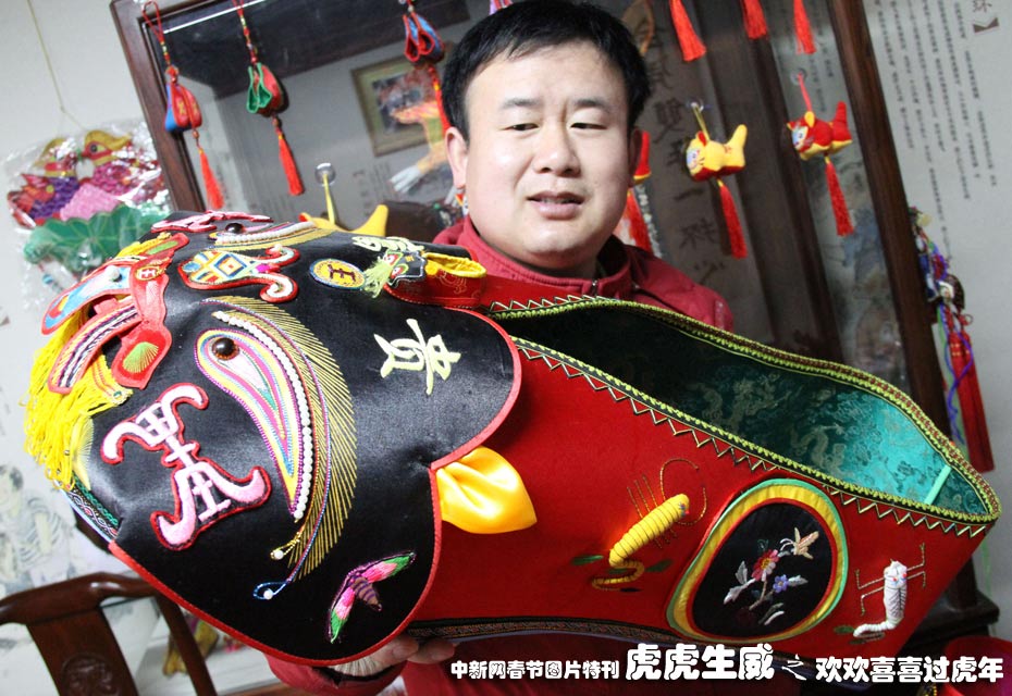 1月18日,南京民間藝人高勇與父母一起花費(fèi)三個(gè)月時(shí)間制作了一只長80厘米、高35厘米的虎頭鞋,日前亮相南京市民俗博物館。據(jù)悉,改鞋共用絲綢3.5米,耗費(fèi)金絲線、絲線和棉線約750米。中新社發(fā) 阿董 攝