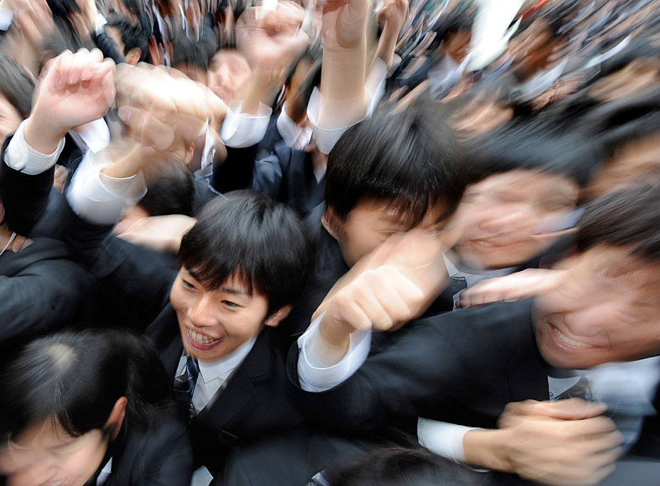 2月10日,日本東京職業(yè)學(xué)校的學(xué)生在求職動(dòng)員會(huì)上伸出拳頭展現(xiàn)信心。日本的失業(yè)率達(dá)5%,2011屆畢業(yè)生將面臨嚴(yán)峻就業(yè)形式。圖片來源:中國新聞網(wǎng)