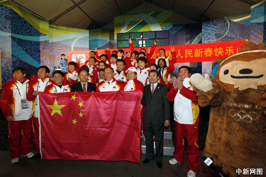 當地時間2月10日,中國代表團在溫哥華冬奧會奧運村舉行升旗儀式。升旗儀式結束后,中國代表團團長劉鵬帶領代表團成員展開橫幅高聲向全體國人送上新春祝福。中新社記者 盛佳鵬 攝