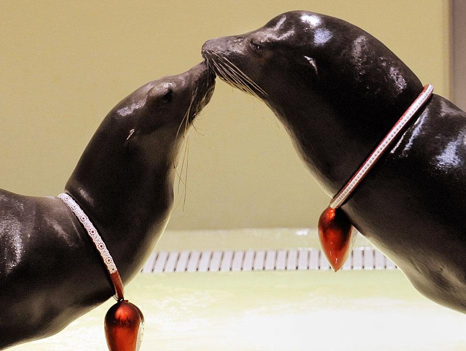 圖為日本東京水族館內(nèi)雄性海獅和雌性海獅親吻。圖片來源:中國新聞網(wǎng)