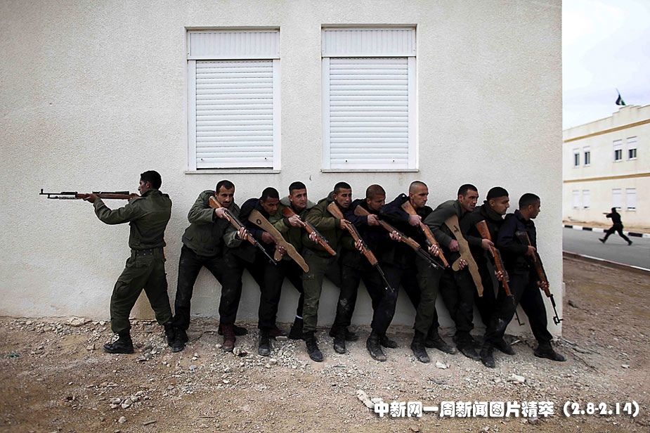 周一(8日)在約旦河西岸Jericho的一處基地,巴勒斯坦安全人員手持模型槍參加訓練。