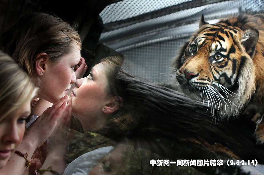 周一(8日)學(xué)生們參觀愛丁堡動物園時,隔著玻璃與一只蘇門達(dá)臘虎面對面。