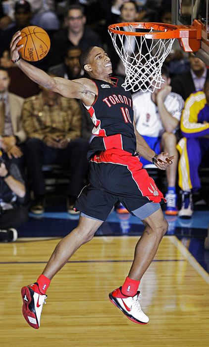 圖為多倫多猛龍隊的德羅贊進行扣籃表演。