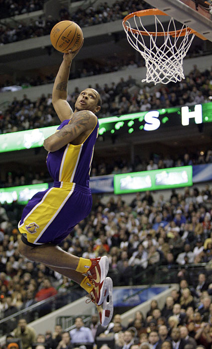 圖為洛杉磯湖人隊(duì)的香農(nóng)布朗進(jìn)行扣籃表演。