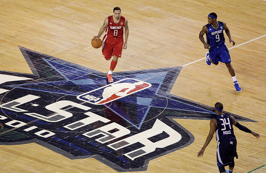 圖為全明星賽賽場上,西部明星隊(duì)正在進(jìn)攻。