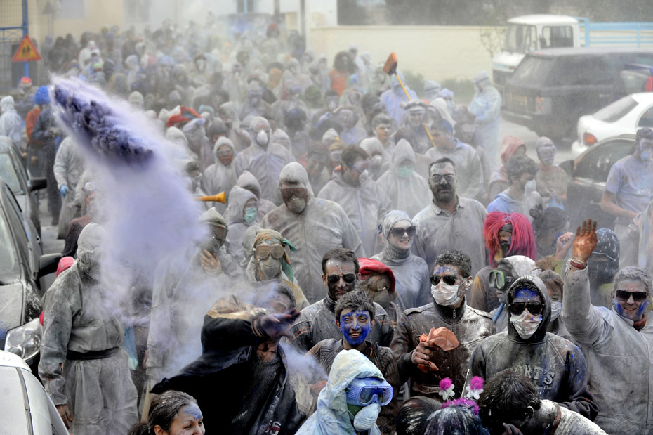 2月15日,希臘港口加拉西迪,狂歡者在街頭參加“面粉大戰(zhàn)”!懊娣鄞髴(zhàn)”是當?shù)貞c祝狂歡季結(jié)束的一項傳統(tǒng)活動,隨后將是為期40天的齋戒月直至復(fù)活節(jié)。圖片來源:中國新聞網(wǎng)