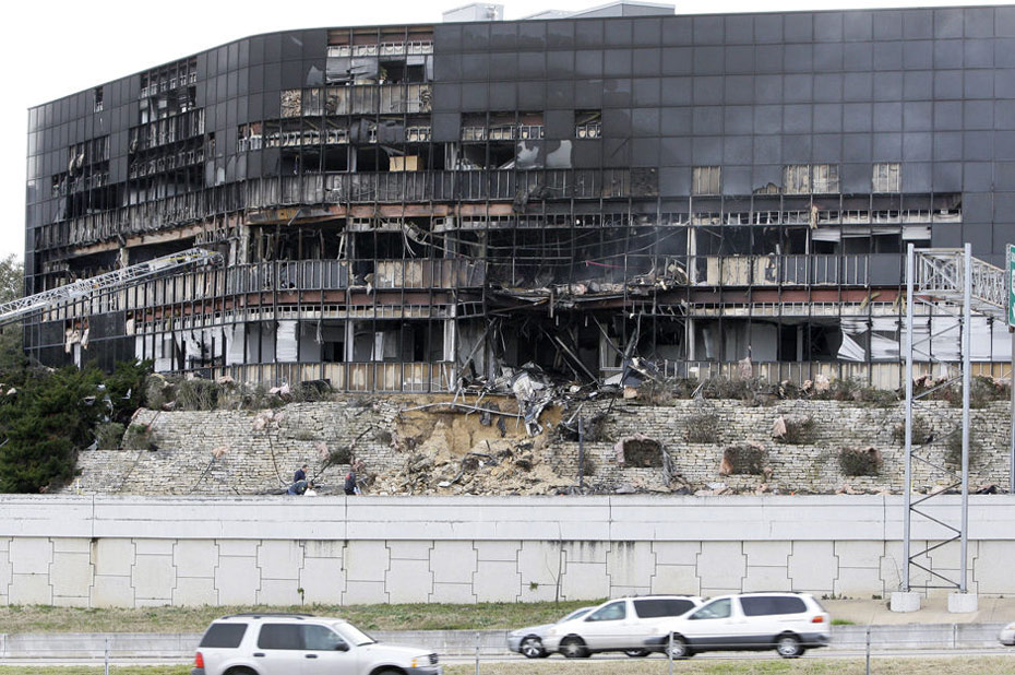 撞機事件導(dǎo)致大樓一面的幾十扇窗戶粉碎,一些樓層天花板塌陷,通過電視畫面,可以看到大樓二三樓層濃煙滾滾,黑煙中不時有竄出的火焰。