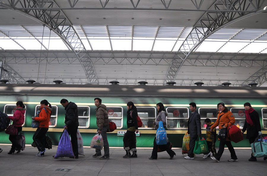 春節(jié)黃金周落幕,節(jié)日的氣氛漸漸淡去,各地春運(yùn)相繼迎來返程客流高峰。圖為2010年2月19日,旅客在安徽阜陽火車站站臺(tái)排隊(duì)上車。盧啟建 攝