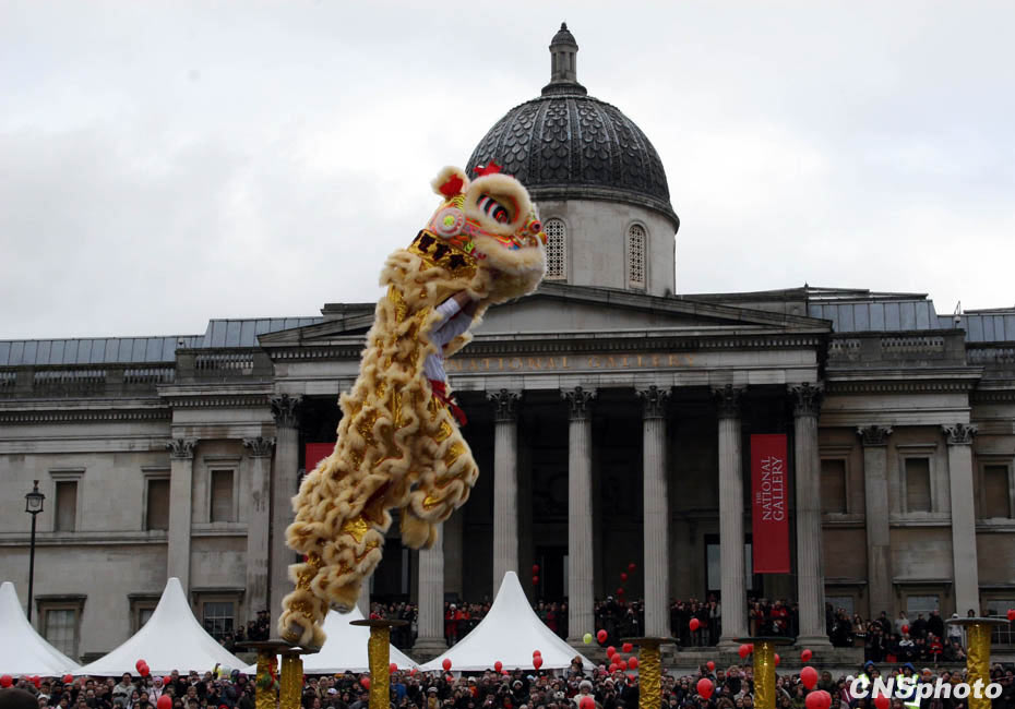 當?shù)貢r間2月21日,亞洲之外最大規(guī)模的春節(jié)慶祝活動——倫敦春節(jié)慶典在倫敦特拉法加廣場、萊斯特廣場及倫敦華埠舉行,圖為當?shù)貎S社舞獅團表演的“梅花樁”,令現(xiàn)場數(shù)萬觀眾發(fā)出驚嘆。 中新社發(fā) 魏群 攝