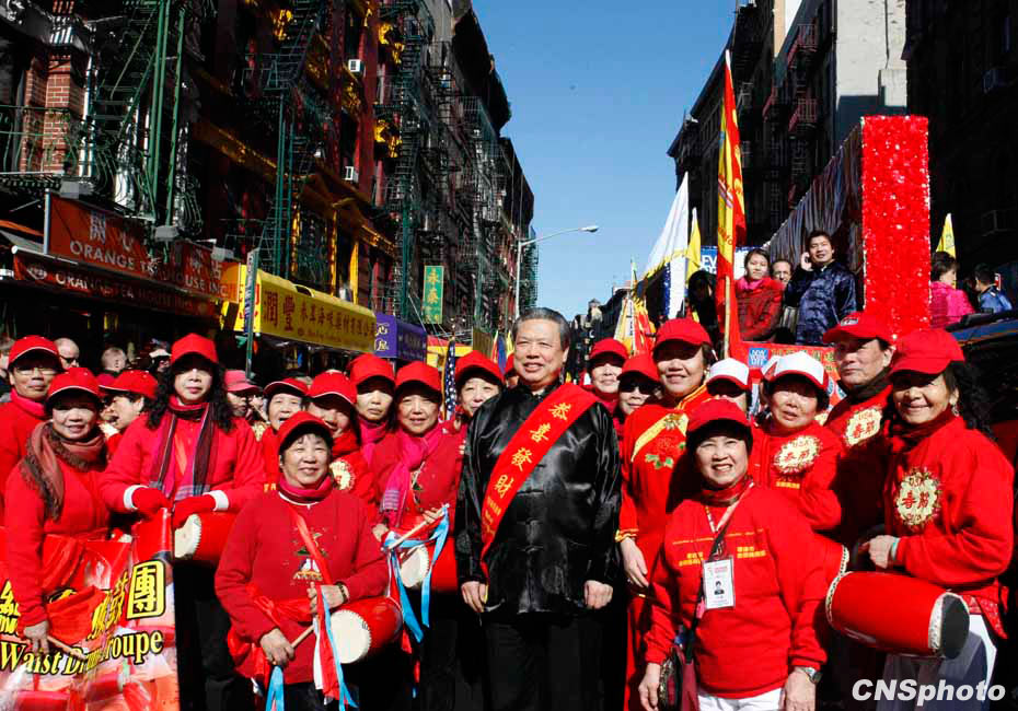 虎年紐約華埠慶祝農(nóng)歷新年“重頭戲”花車大游行21日登場(chǎng),吸引超過(guò)10萬(wàn)人圍觀共同狂歡,成為歷年來(lái)參加人數(shù)最多的一次花車游行。12輛盛裝花車以及數(shù)千人的表演團(tuán)隊(duì)沿著華埠最熱鬧的數(shù)十條街道一邊行進(jìn)一邊表演,滿天彩帶飄揚(yáng),場(chǎng)面熱鬧非常。圖為中國(guó)駐紐約總領(lǐng)事彭克玉在游行隊(duì)伍中。中新社發(fā) 魏晞 攝