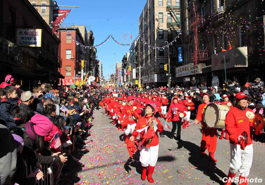 虎年紐約華埠慶祝農(nóng)歷新年“重頭戲”花車大游行21日登場(chǎng),吸引超過10萬人圍觀共同狂歡,成為歷年來參加人數(shù)最多的一次花車游行。12輛盛裝花車以及數(shù)千人的表演團(tuán)隊(duì)沿著華埠最熱鬧的數(shù)十條街道一邊行進(jìn)一邊表演,滿天彩帶飄揚(yáng),場(chǎng)面熱鬧非常。中新社發(fā) 魏晞 攝
