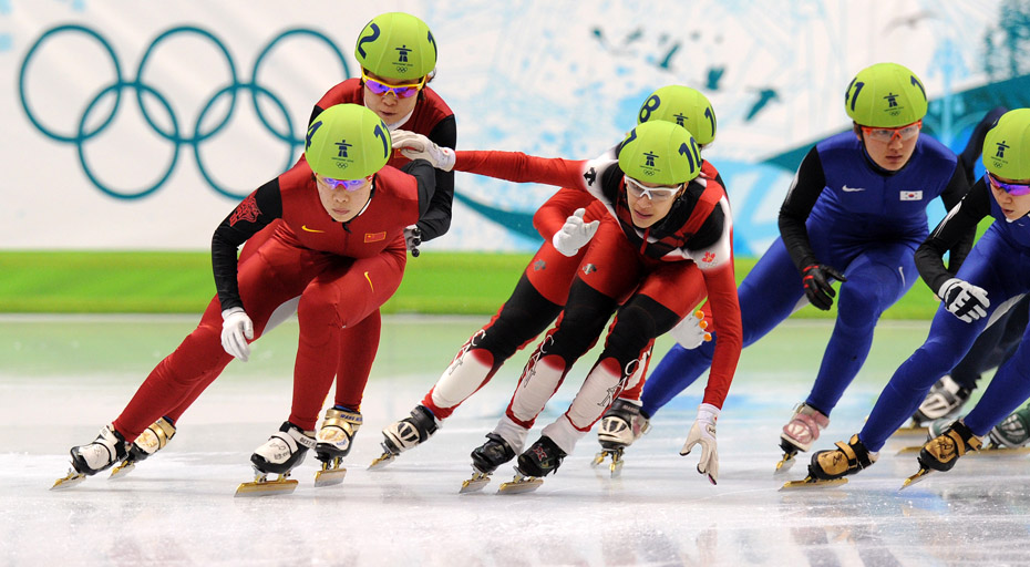 當(dāng)?shù)貢r(shí)間2月24日,溫哥華冬奧會(huì)女子短道速滑3000米接力A組決賽中,中國(guó)隊(duì)王濛、周洋、孫琳琳、張會(huì)四朵金花聯(lián)袂出擊,最終將金牌歸入中國(guó)隊(duì)囊中。圖片來(lái)源:中國(guó)新聞網(wǎng)