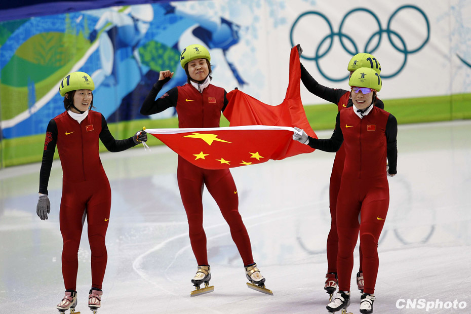 當?shù)貢r間2月24日,溫哥華冬奧會女子短道速滑3000米接力A組決賽中,中國隊王濛、周洋、孫琳琳、張會四朵金花聯(lián)袂出擊,最終將金牌歸入中國隊囊中。圖片來源:中國新聞網(wǎng)