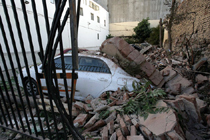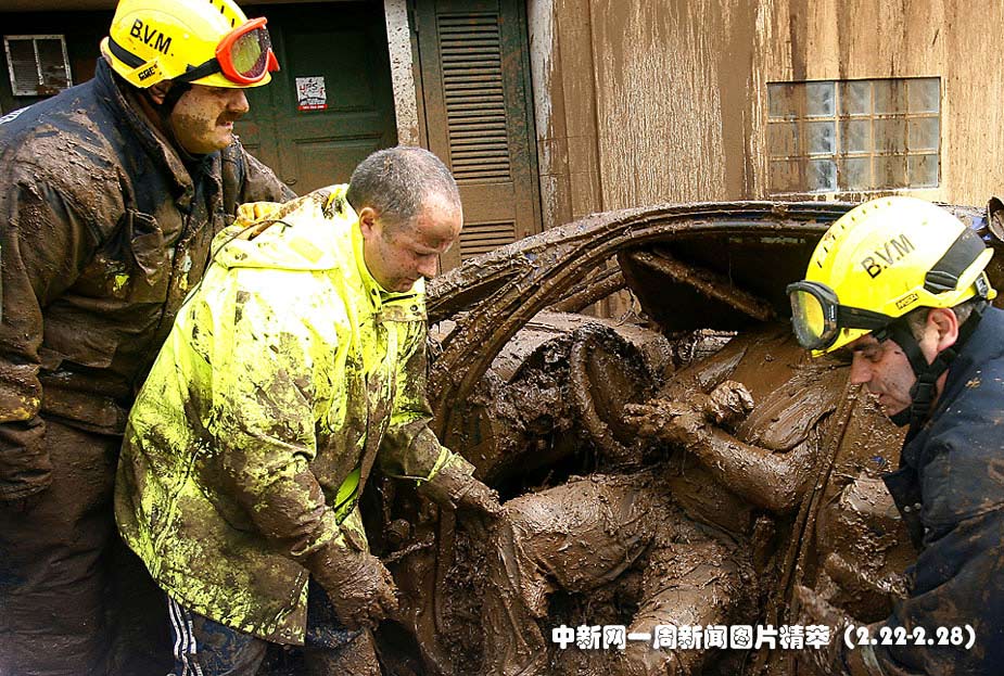 22日(周一),在葡萄牙馬德拉島豐沙爾市,救援人員在移出車廂內的遇難者遺體。當?shù)卣硎,由洪災引發(fā)的泥石流導致42人死亡,32人失蹤。