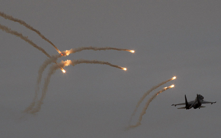 2月28日,印度空軍在該國西部地區(qū)舉行大規(guī)?罩谢鹆φ故狙萘暎鰟恿税ā百M爾康”空中預警機、蘇-30戰(zhàn)斗機、米格-29戰(zhàn)斗機、幻影-2000戰(zhàn)斗機、伊爾-76運輸機和米-35武裝直升機等約百架戰(zhàn)機。圖片來源:中國新聞網(wǎng)