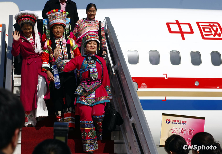 3月2日,參加全國兩會的代表、委員陸續(xù)抵達(dá)北京。圖為云南代表團(tuán)的少數(shù)民族代表盛裝抵京。中新社發(fā) 杜洋 攝