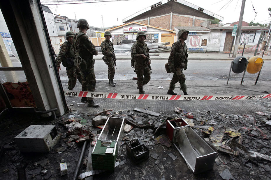 3月2日,智利軍警在街頭維持秩序。智利總統(tǒng)巴切萊特當(dāng)日說,政府派往災(zāi)區(qū)維持治安的軍人數(shù)量已達(dá)14000人,地震重災(zāi)區(qū)的搶劫現(xiàn)象已得到控制。圖片來源:中國新聞網(wǎng)