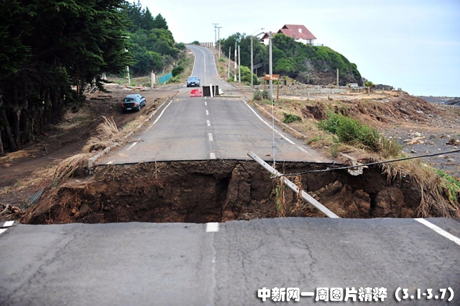 3月2日,在智利佩尤韋,一條公路發(fā)生斷裂。智利大地震已過去3天,目前已有至少796人喪身。智利總統(tǒng)巴切萊特稱,部隊已經(jīng)部署到位。此外她還會見了美國國務(wù)卿希拉里•克林頓。政府部門已經(jīng)開始分發(fā)食物。圖片來源:中國新聞網(wǎng)