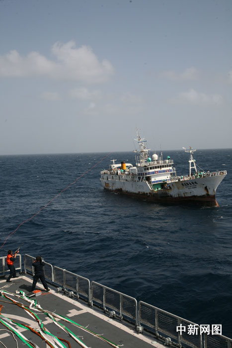 09年4月在西印度洋遭索馬里海盜挾持的臺(tái)灣遠(yuǎn)洋漁船“穩(wěn)發(fā)161號(hào)”,歷經(jīng)各方營(yíng)救,終于在遭挾持10個(gè)多月后,包括船長(zhǎng)顏勝男等共28人返回高雄港。圖片來(lái)源:中國(guó)新聞網(wǎng)