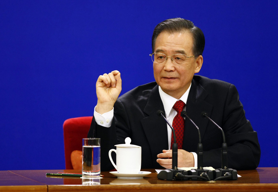 3月14日上午,國(guó)務(wù)院總理溫家寶在人民大會(huì)堂三樓金色大廳與采訪十一屆全國(guó)人大三次會(huì)議的中外記者見(jiàn)面并回答記者提出的問(wèn)題。中新社記者 杜洋 攝 圖片來(lái)源:中國(guó)新聞網(wǎng)