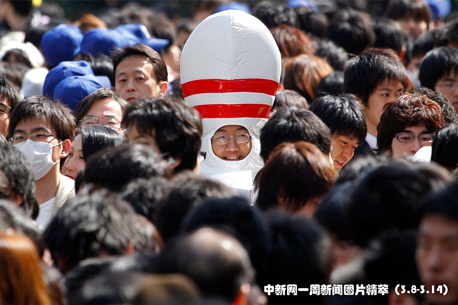 周三,日本東京大學(xué)校園里,一名學(xué)生裝扮成保齡球瓶的樣子。當(dāng)天,這所日本最富盛名的大學(xué)放榜,眾多考生前往查榜。圖片來源:中國新聞網(wǎng)