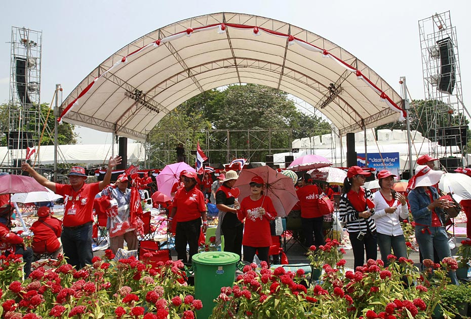 3月13日起,泰國“紅衫軍”陸續(xù)從泰國北部、東北部等外府進入曼谷市,在集會主會場搭設(shè)演講舞臺和帳篷,拉開大規(guī)模示威序幕。圖片來源:中國新聞網(wǎng)