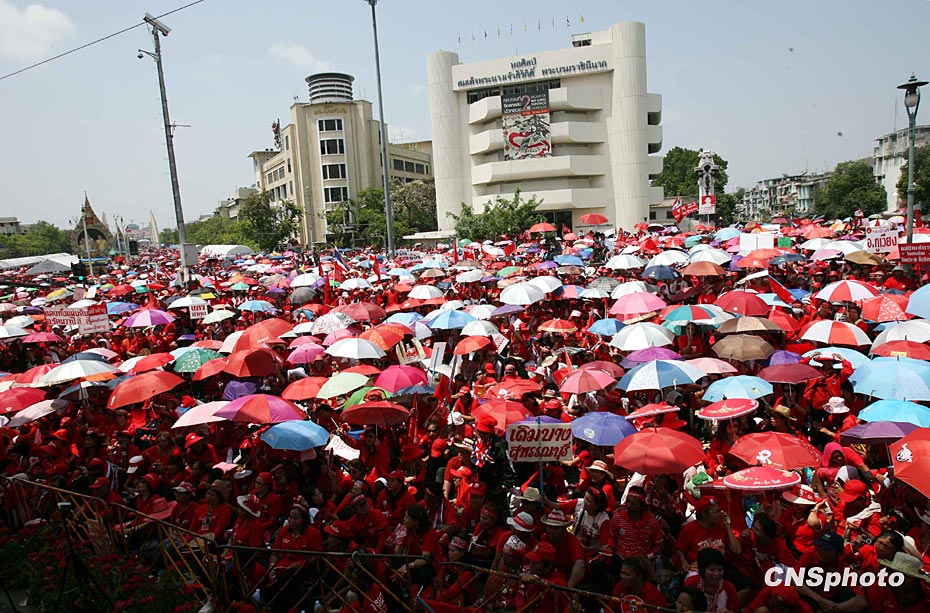 3月13日起,泰國(guó)“紅衫軍”陸續(xù)從泰國(guó)北部、東北部等外府進(jìn)入曼谷市,在集會(huì)主會(huì)場(chǎng)搭設(shè)演講舞臺(tái)和帳篷,拉開大規(guī)模示威序幕。圖片來源:中國(guó)新聞網(wǎng)