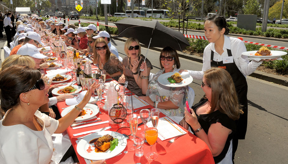 近日,澳大利亞墨爾本,人們?cè)谔?hào)稱“世界上最長(zhǎng)的午餐”活動(dòng)中享受美味佳肴。圖片來(lái)源:中國(guó)新聞網(wǎng)