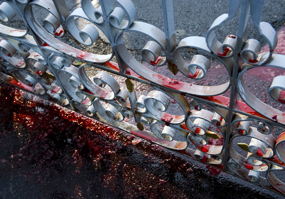 泰國(guó)反政府組織“紅衫軍”成員將血液潑灑在曼谷總理府門前,以此向政府施壓要求解散國(guó)會(huì)下議院。圖片來源:中國(guó)新聞網(wǎng)